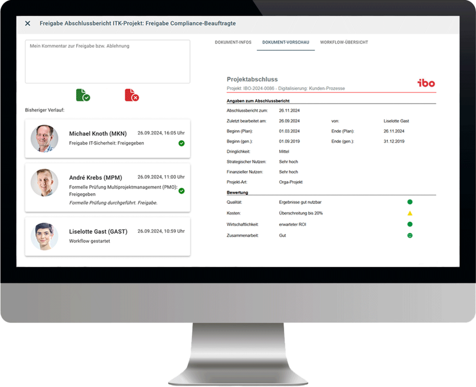 In diesem Video stellen wir Ihnen die frei definierbaren Freigabeworkflows in ibo netProject vor. Mit diesen Workflows können Sie dafür Sorge tragen, dass Dokumente von allen relevanten Instanzen freigegeben und kommentiert werden können.