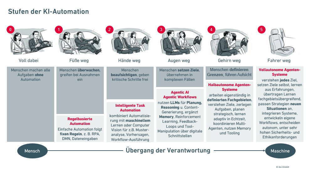Man kann die Stufen von Agenten im Prozessmanagement mit den Stufen des autonomen Fahrens vergleichen: Von regelbasierter Automation über intelligente Task Automation bis zu Agentic Workflows und vollautonomen Agenten wandert Verantwortung schrittweise von Menschen zu Systemen.